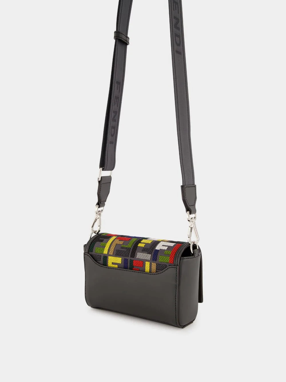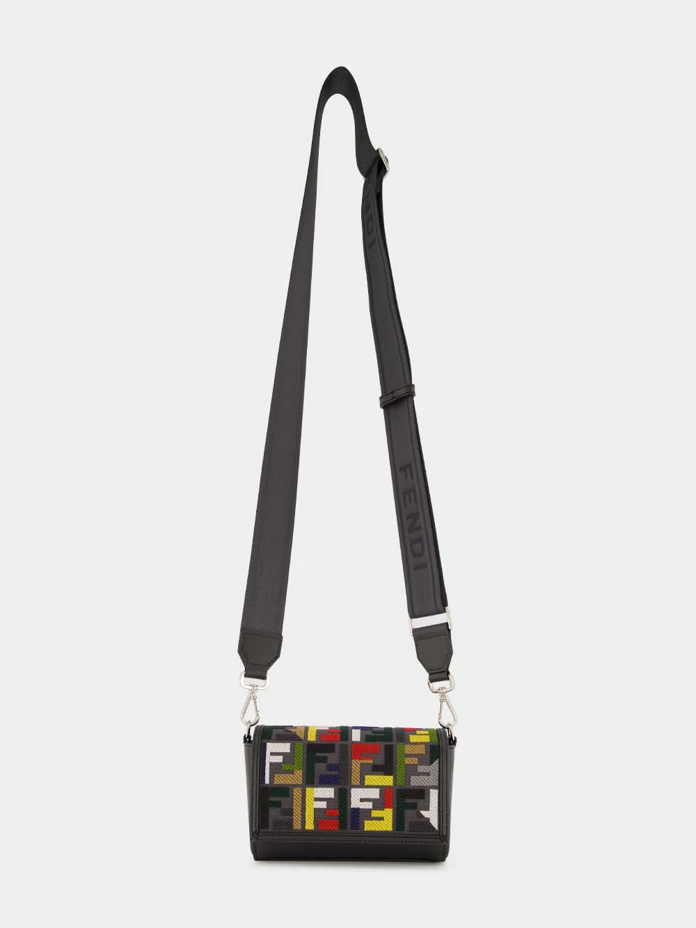Product: Fendi compact messenger bag featuring multicolour embroidered FF motif on dark grey canvas.