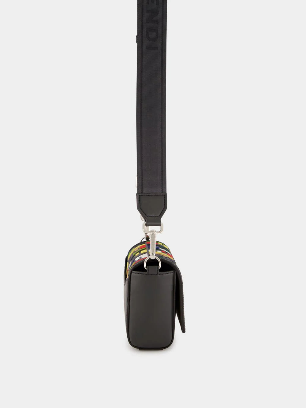 Features: Magnetic flap closure, flat exterior pocket, lined interior with zip pocket, adjustable and detachable tech-fabric cross-body strap with "FENDI" lettering.